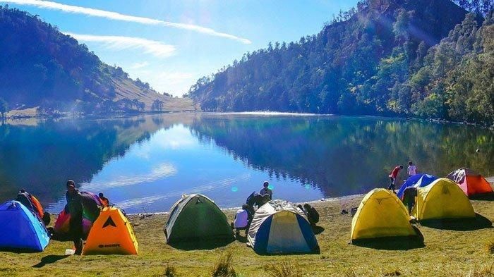 Ranu Kumbolo menjadi salah satu destinasi camping yang populer bagi pendaki Semeru dan pecinta alam. Wisatawan menikmati danau jernih yang dikelilingi bukit hijau dengan suasana sejuk.