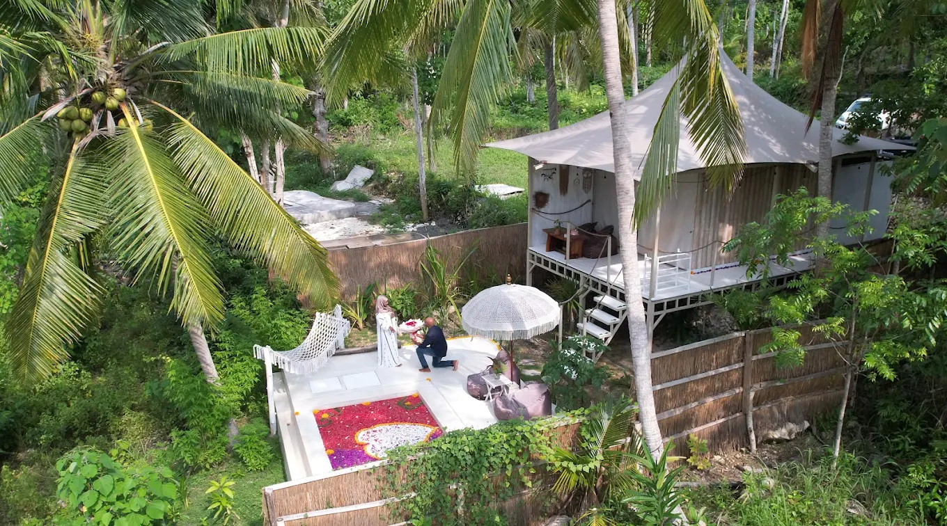 Exotic Luxury Private Glamping menawarkan pengalaman glamping yang lebih eksklusif dengan tenda safari mewah di tengah alam tropis Nusa Penida. Setiap tenda dirancang dengan fasilitas premium seperti AC, Wi-Fi, kamar mandi pribadi, dan balkon dengan pemandangan laut atau perbukitan. Selain itu, lokasinya juga dekat beberapa destinasi populer seperti Pantai Gamat Bay dan tebing populer.
