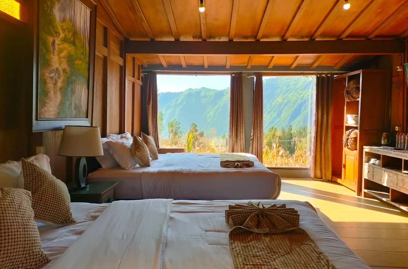 Setiap kamar memiliki balkon pribadi dengan pemandangan perbukitan Tengger. Momen terbaik di sini adalah saat senja, ketika langit berubah warna dan menciptakan suasana romantis yang natural tanpa perlu effort berlebihan.