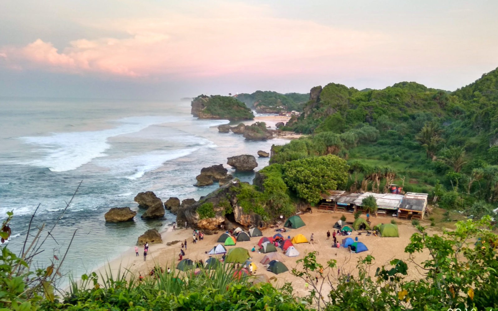 Pantai Ngrumput di Gunungkidul jadi spot camping favorit buat kamu yang ingin menikmati suasana pantai yang tenang dan jauh dari keramaian. Dikelilingi tebing hijau dan hamparan pasir putih, tempat ini menawarkan pengalaman berkemah yang santai namun tetap memukau.