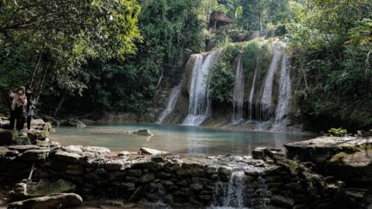Tempat ini menawarkan suasana alam yang asri dengan keindahan air terjun yang membentuk sebuah tirai air. Letaknya yang berada di tengah hutan, serta suara gemericik air dan kicauan burung akan membuatmu bisa menikmati suasana tenang tanpa gangguan